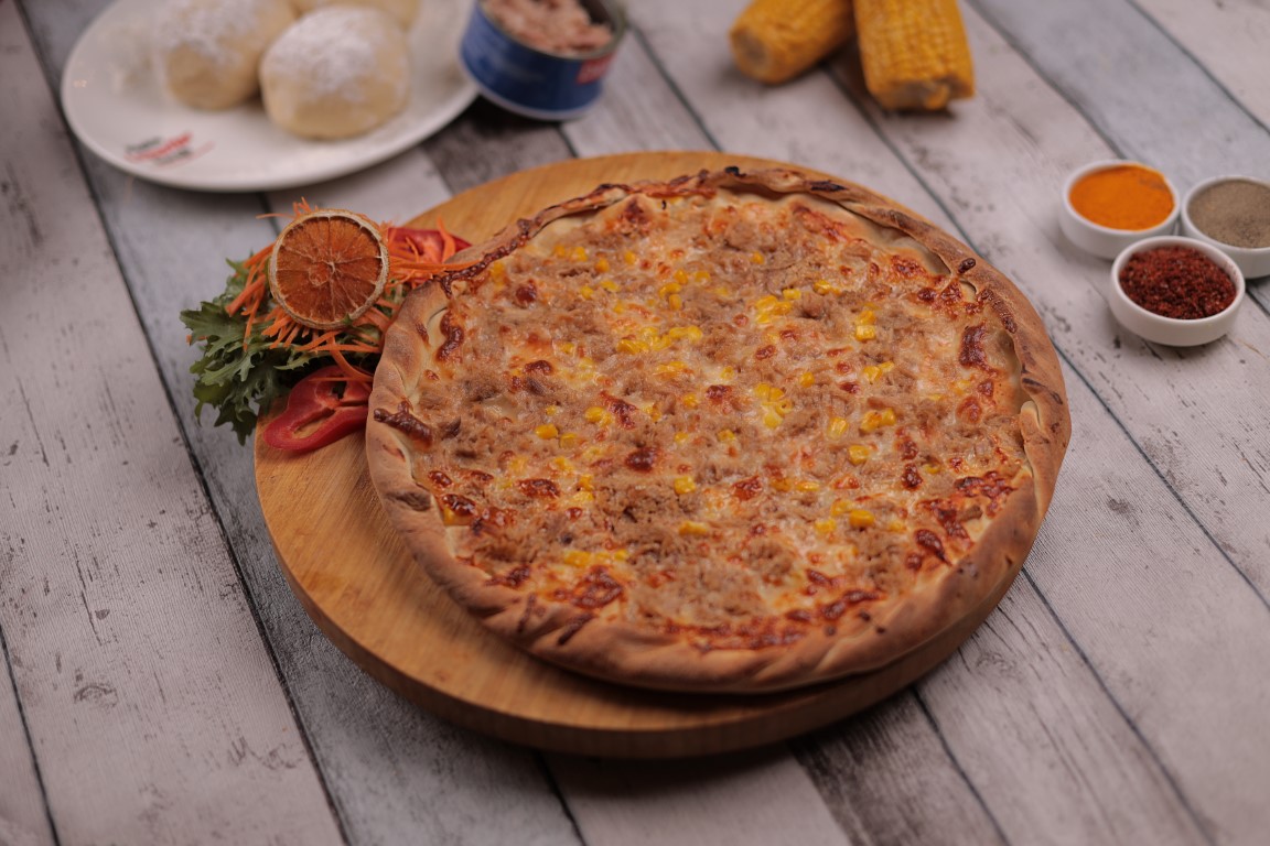 Özel pizza sosu, mozarella peyniri, ton balığı ( 180 gr ) mısır ile servis edilir.